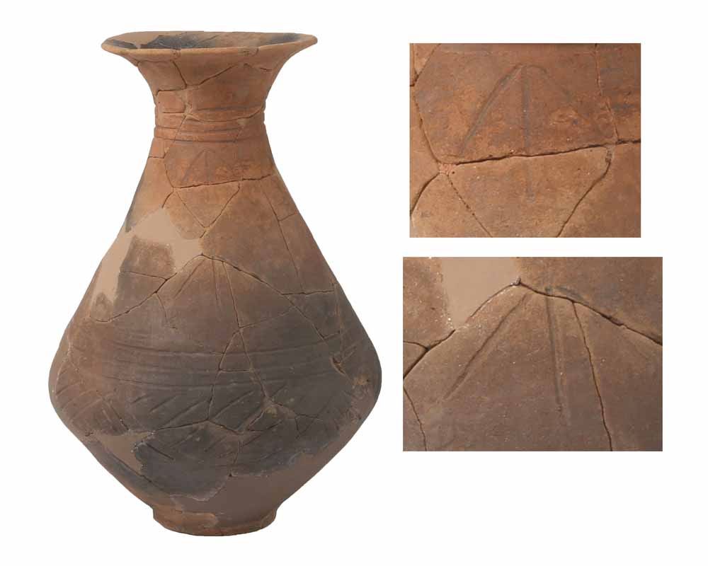 胴部に上を向いた矢印文様が描かれています。弥生時代中期の栗林式土器です。