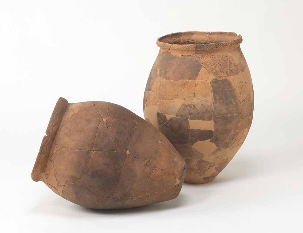 弥生時代中期の甕形土器を用いた土器棺墓と思われる土器が出土しました。右側奥の甕が高さ55㎝です。