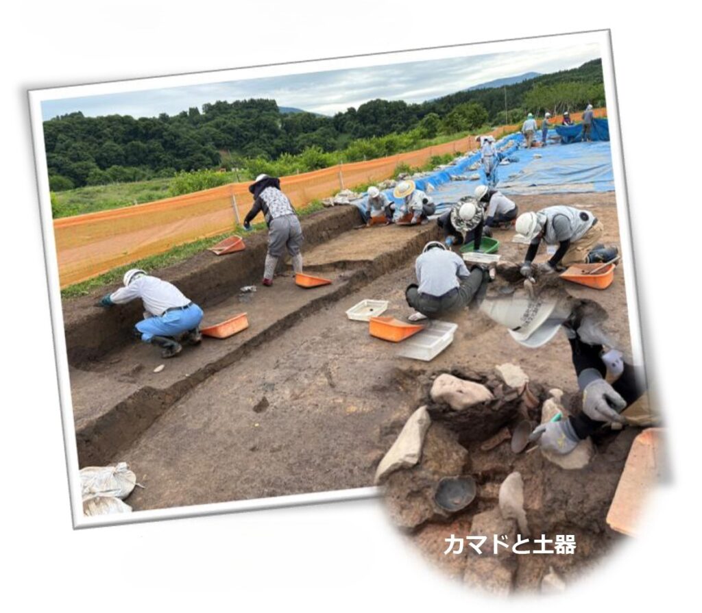 竪穴建物跡からはカマド以外に柱穴、敲きしめられた床、割れていない土器など当時の生活を考える手がかりが多くみつかっています。