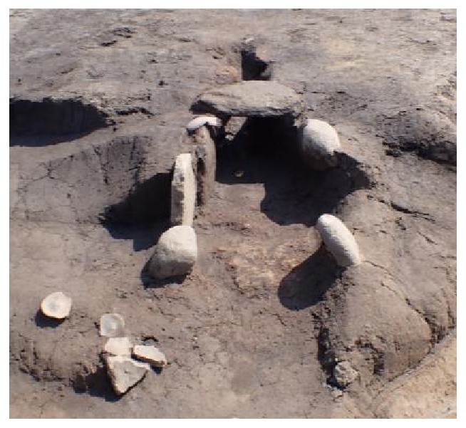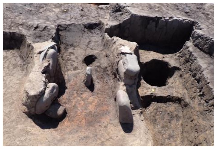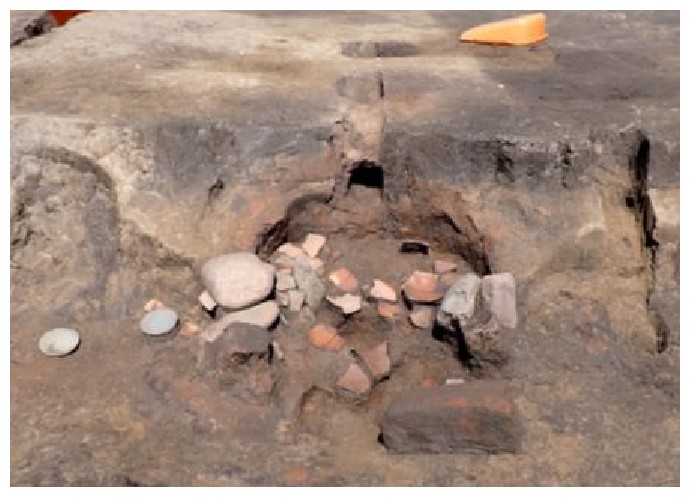 下の写真は、竪穴建物跡に付随するカマドです。SB136は煙り出しの穴がトンネル状に確認され、SB142では、カマドに掛けた土師器の甕を支える支脚石が確認されました。