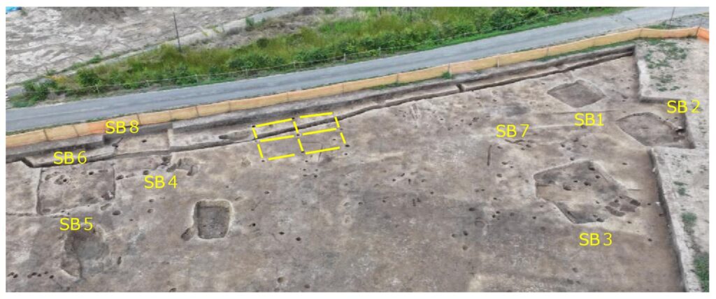7月16・17日の現地公開で竪穴建物跡の細部についてご覧いただいた方もいらっしゃると思いますが、全体的にみると下の写真のように2間×2間の総柱建物跡を中心に、東側に4軒、西側に4軒の竪穴建物跡が分布します。西側の4軒は現市道側まで延びています。いずれも重複しており、これは1軒ずつ4時期に渡り建て替えられていたことを示しています。一方、東側の4軒は重複することもなく最大で4軒同時存在したことが考えられます。また、SB2・3はカマドを造り替えており、長い期間、使用されていたと想定されます。今後、出土した土器等を分析して、竪穴建物跡の時期を特定できればと考えています。今後の整理作業に乞うご期待です。