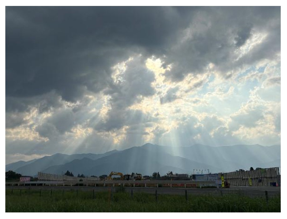 4月からの発掘調査が続いています。一日の調査が終わり、暑さが和らいだ夕方に北アルプス方向を臨むと、雲の隙間から太陽の光が放射状に広がる幻想的な風景がみえます。仏や菩薩が発する光である「後光」が差すような光景です。
