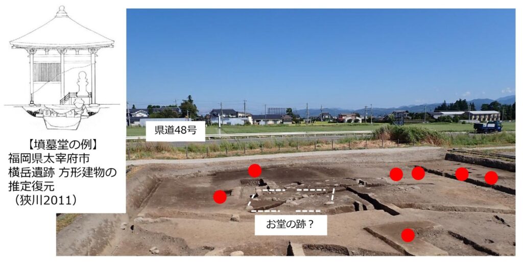 お堂と考えられる礎石建物跡と火葬遺構(南から臨む)赤丸:火葬遺構