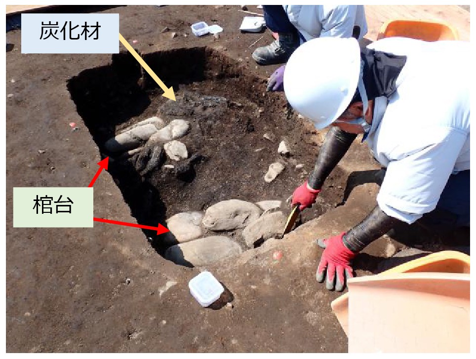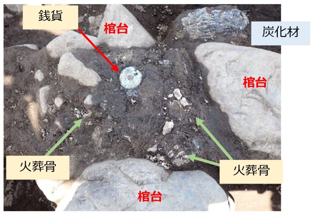 火葬遺構からは多くの炭化材が出土しました。炭化材には板材・角材・丸太材があり、それらの材は棺や火葬で燃やした木材や火葬遺構の上に渡した木材であったと思われます。また、火葬遺構の底からは、棺を置くための「棺台」の石が2列に並び発見されました。底近くにある棺台付近からは、やや大きい火葬骨と銭貨が出土したため、火葬した遺体が遺構の底に落ちたものと思われます。