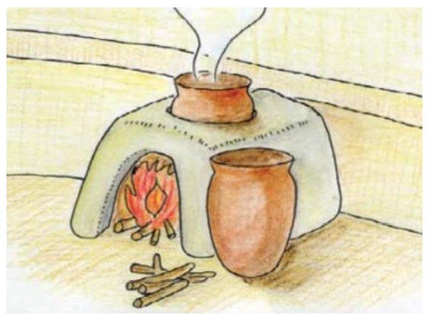 竪穴建物跡の壁には調理場であるカマドが作られます。粘土でカマドの壁と天井を形作り、壁の芯材には大きな石を使い、天井には穴を開けて煮炊きをする甕を差し込みます。調査中、多くのカマドは破壊された状態でみつかります。カマドは火の神が宿る特別な場所と考えられており、建物を廃棄する際にカマドを破壊する習慣が存在したようです。この建物では、カマドの一部を破壊し、その後、火床の上に支脚石を叩き折って置き、さらにその上に底を抜いた甕を立て、周りを芯材の石(花崗岩)で囲う様子が確認できました。