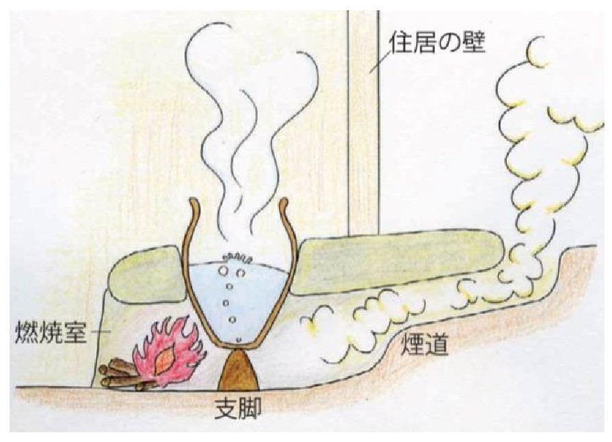 奥壁に底を抜いた甕を立てて、周囲を芯材の石で囲むカマド