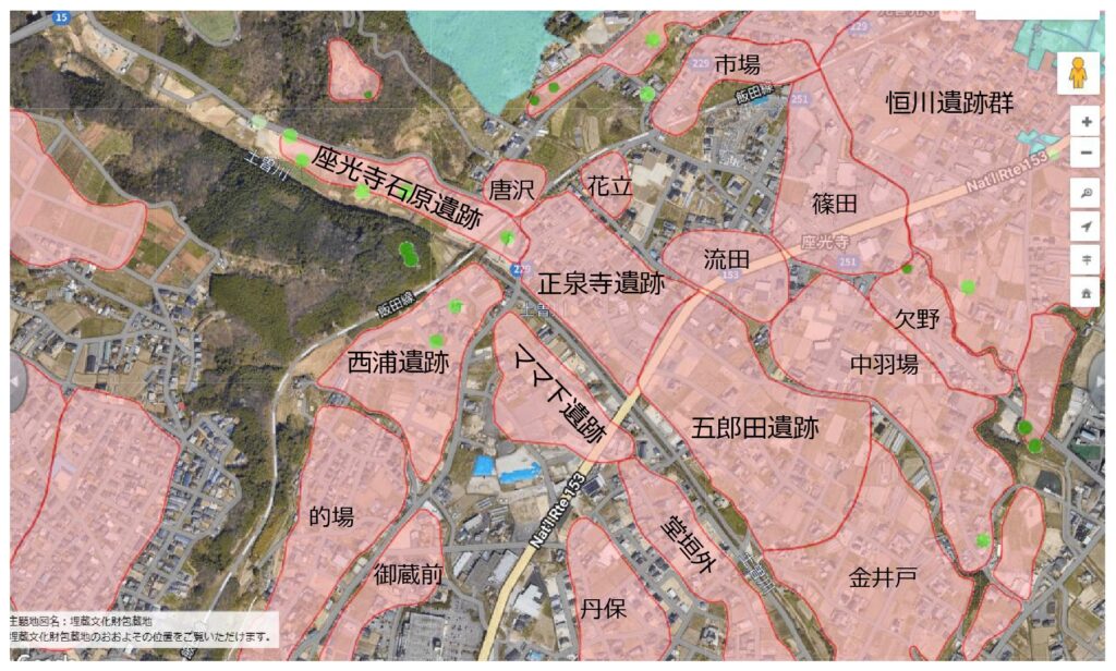 近年、遺跡周辺では様々な公共事業に先立つ遺跡の発掘調査が進められています。土曽川が形成した微高地上に広がる正泉寺遺跡や五郎田遺跡、対岸のママ下遺跡では同じ時代の集落跡がみつかっていることから、今後これら集落のまとまりや移り変わりなどを明らかにしていきたいと考えています。