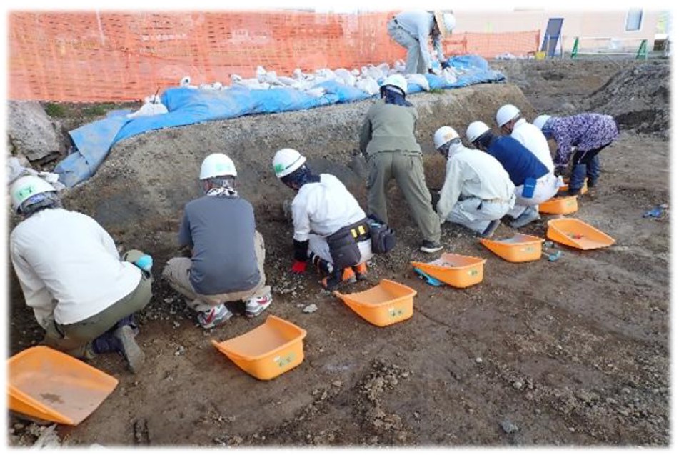 重機を使って表土掘削を行った後、人力で土の表面を削り、土の違いから、土坑(穴)や竪穴建物跡などの遺構をみつけます。