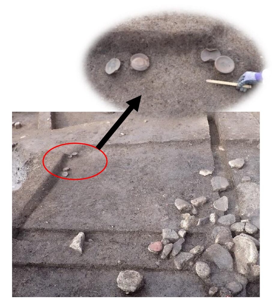 竪穴建物跡のコーナー付近の床面から、完全な形の耳皿や小形の皿がまとまって出土しました。遺物から11世紀の遺構と考えられます。正泉寺遺跡では初めての発見です。