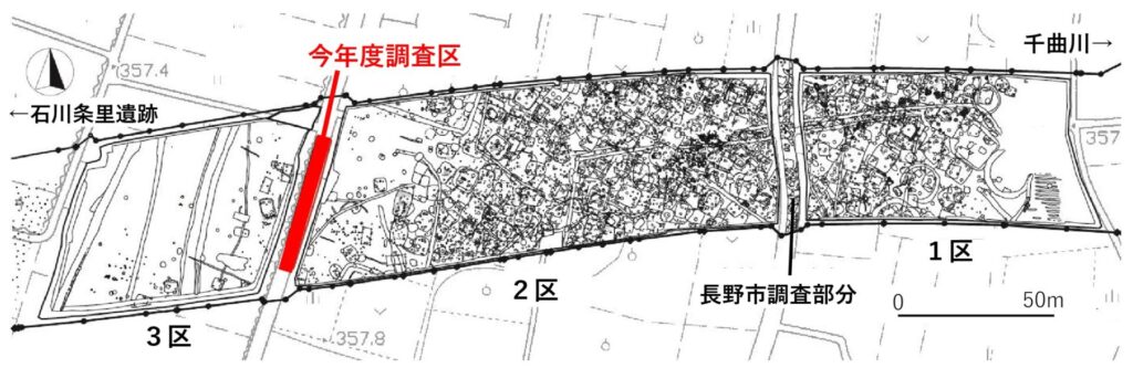 10月10日から始まった今年度の発掘調査は、11月29日に終了しました。塩崎遺跡群では、2013(平成25)年から2017(平成29)年にかけて、東側(千曲川側)の1区から西側(石川条里遺跡側)の3区に向かって発掘調査を行ってきました。今年度は最後に残された3区東脇の市道下の調査を行い、これをもって発掘調査は全て終了しました。長年にわたり皆さまのご協力をいただき、ありがとうございました。