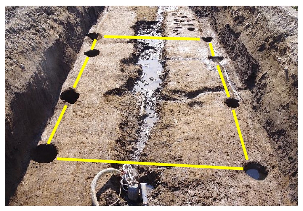 調査区の幅にピタリと収まって検出された掘立柱建物跡