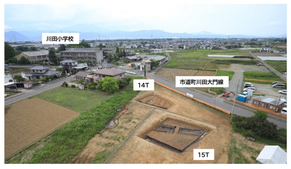 7月下旬から市道町川田大門線北側でT12調査区の発掘調査が始まりました。現在は中世と想定される面の調査を行っています。